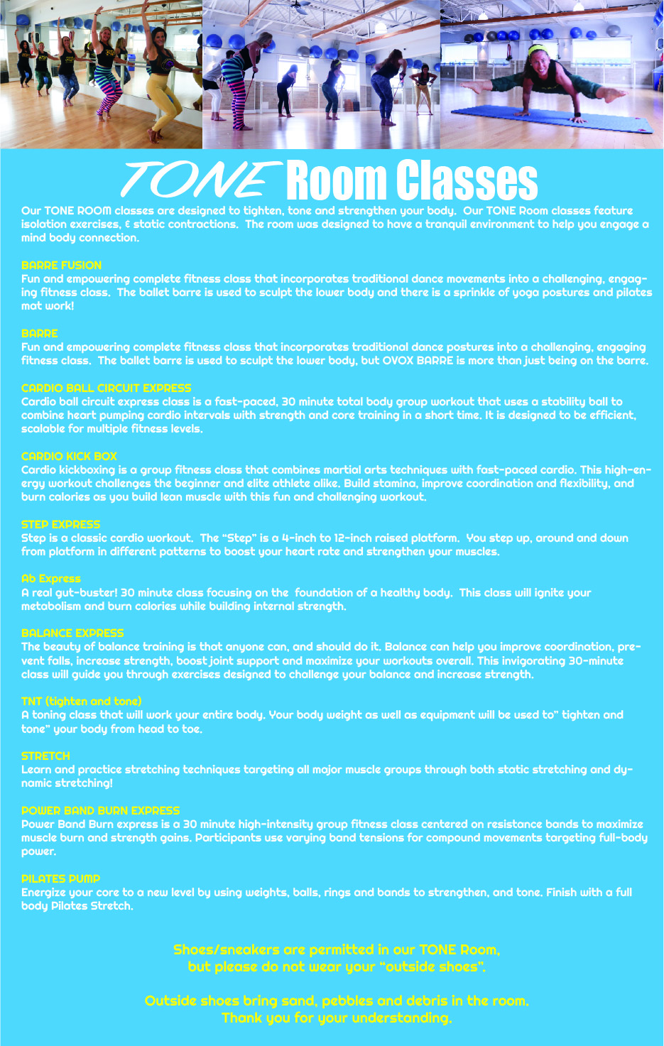Our Class Studio features The TOUGH Room & The TONE Room. Two different rooms, two different vibes, two different class schedules; ONE REASON: motivating, challenging classes that produce results. The TOUGH ROOM features OBOX: our Kickboxing Class, Body Change: our Bootcamp classes, and more. The TONE ROOM features our Mind/Body Fusion, Upper & Lower body Express, Toning classes and more.